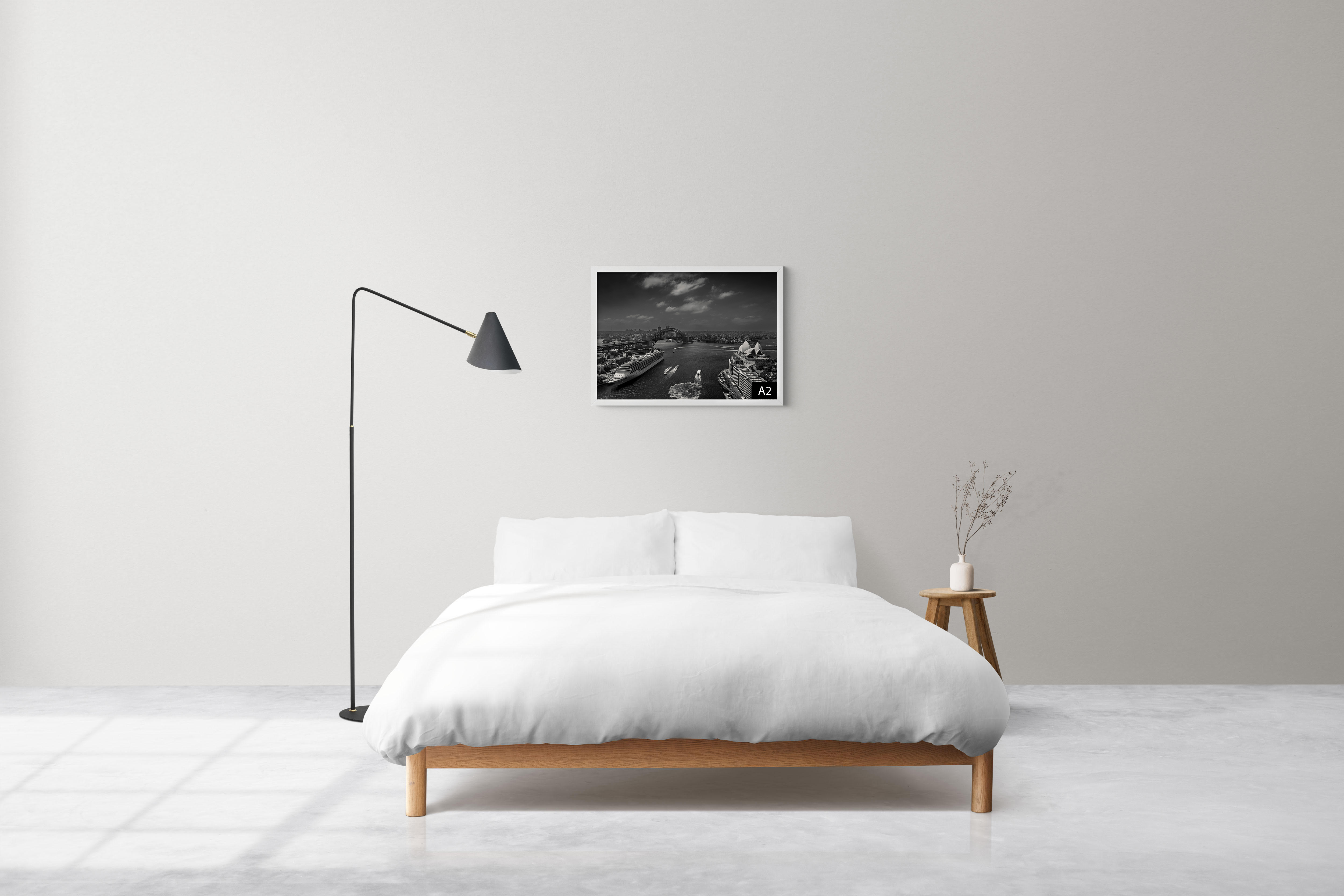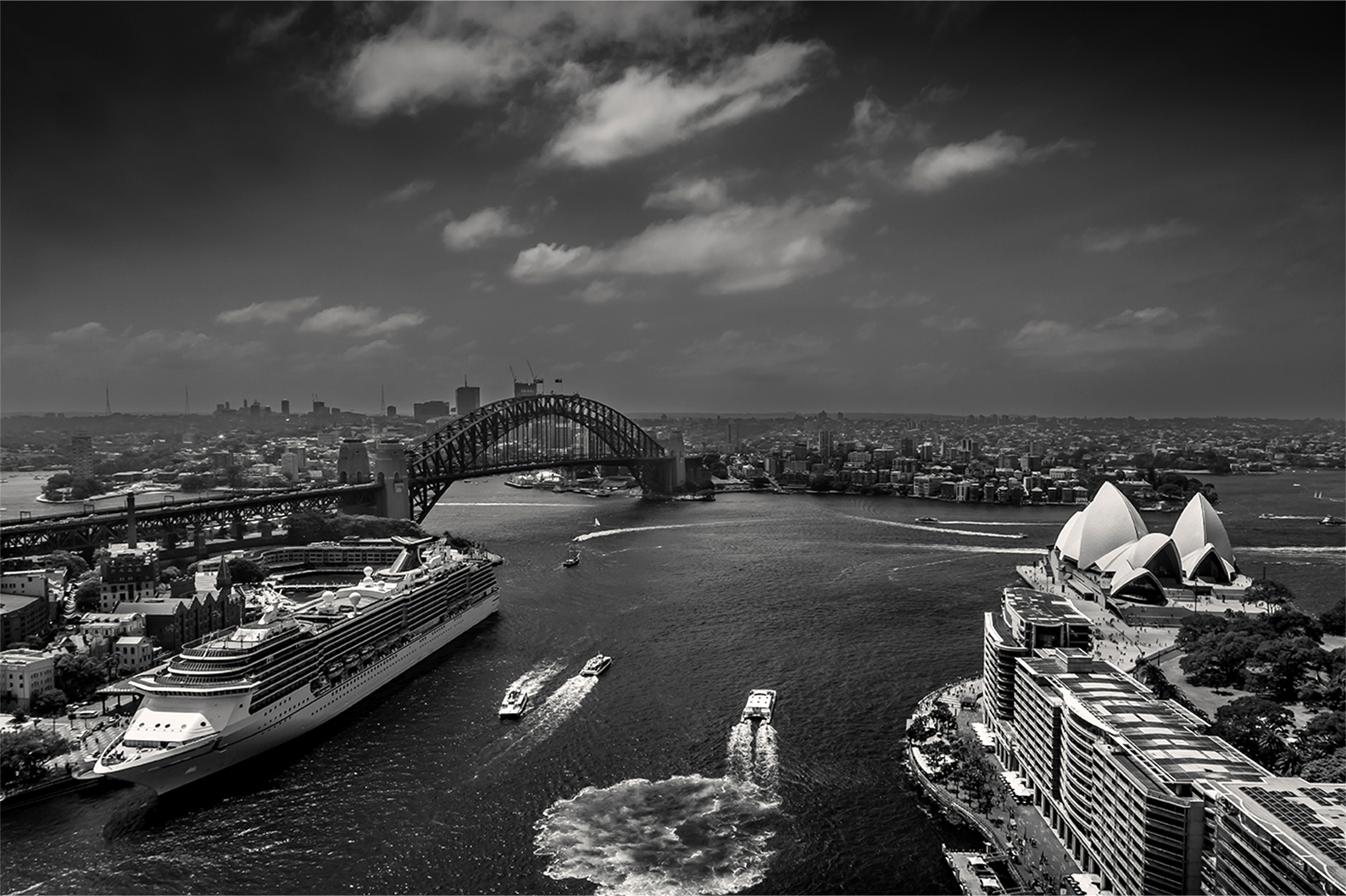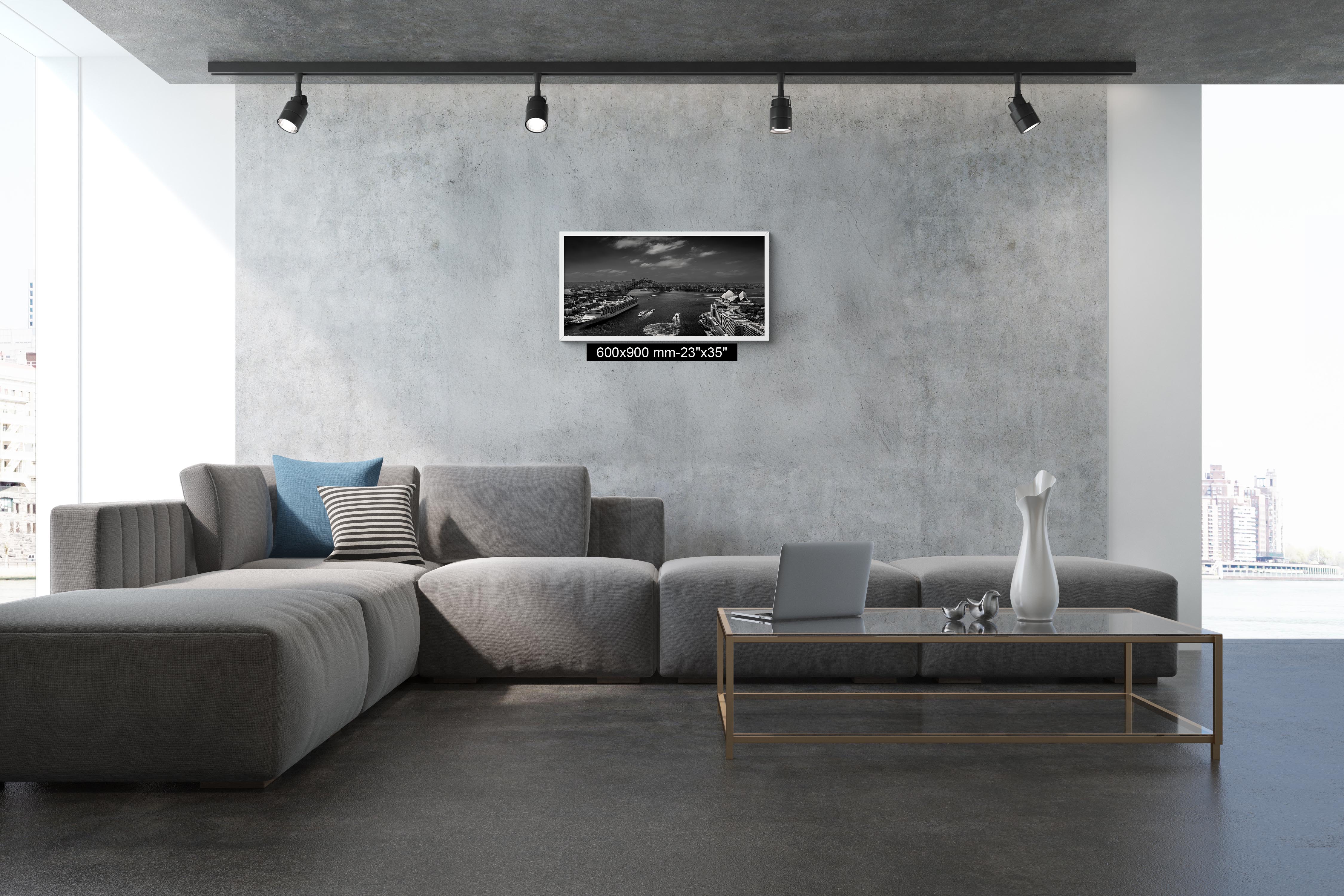 On the water below, a cruise ship rested near The Rocks while ferries moved across the harbour, adding life and movement to the scene. Presented in classic black and white, the image feels both timeless and authentic, emphasising the architectural forms, textures, and atmosphere of the harbour.